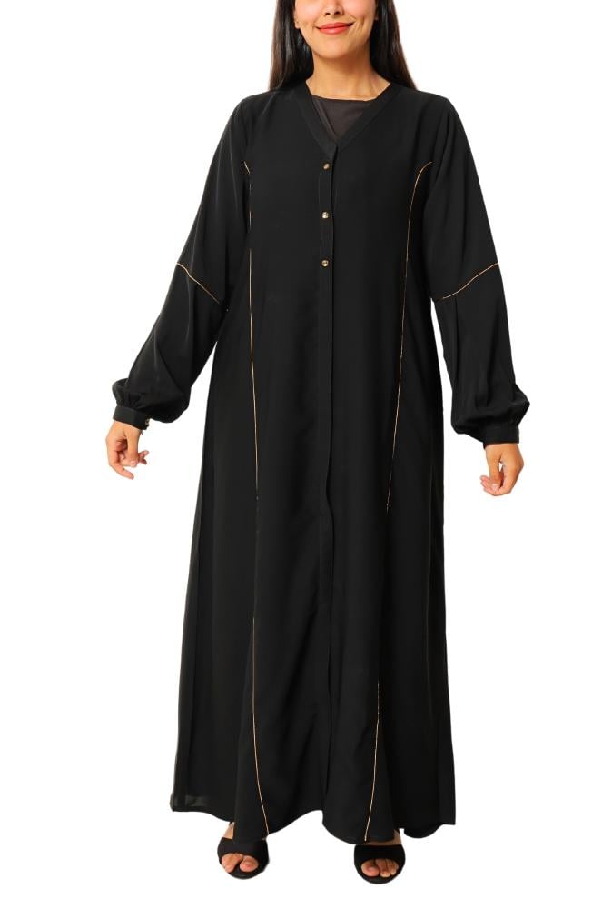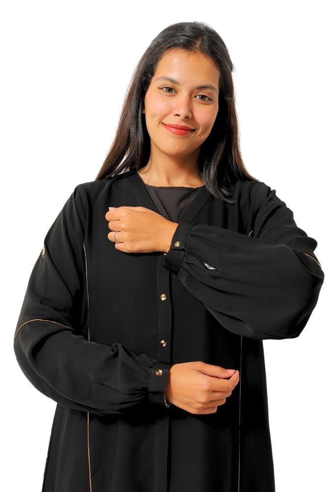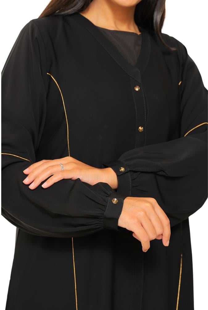 عباية بطرحة قيطان ذهبي بأزرار أمام ياقة صغير أنيق بكرستال في الصدر