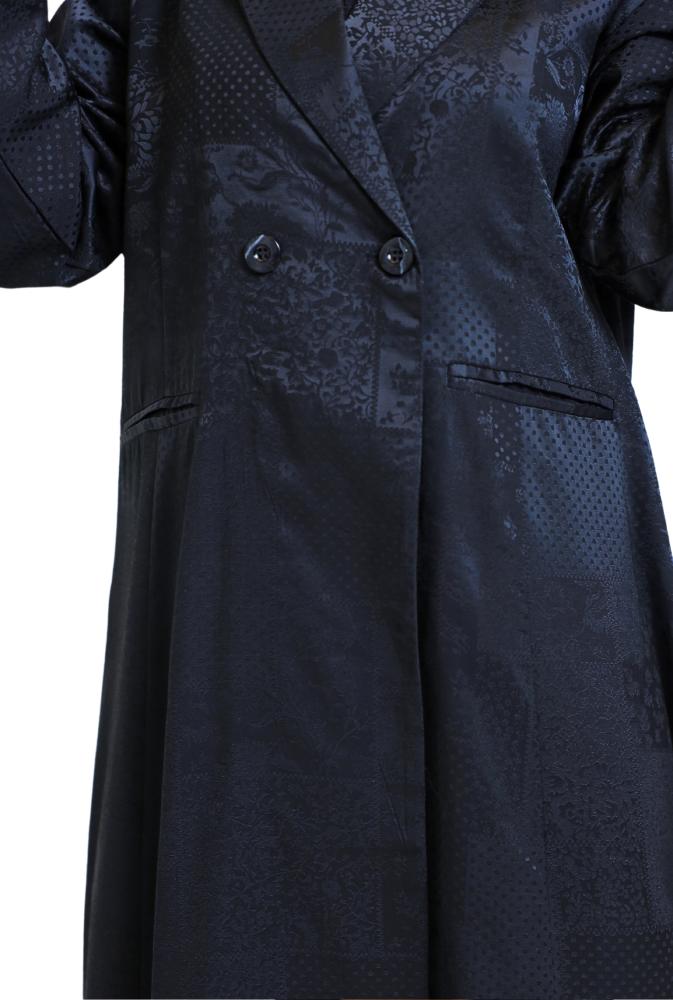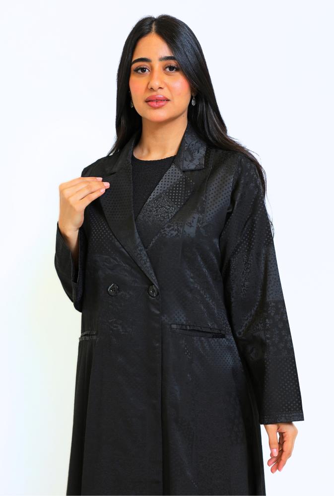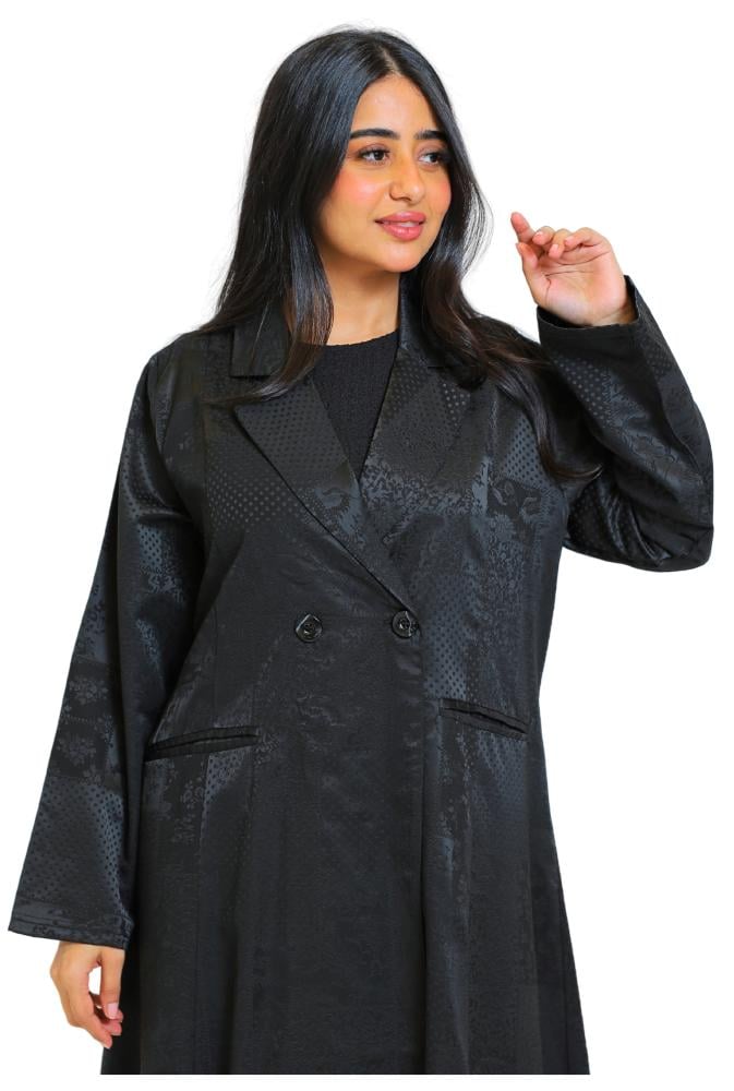 عباية ياقة جاكت زرارين تتميز بقماش جاكر مشجر