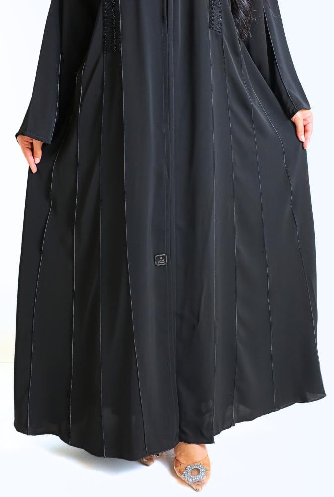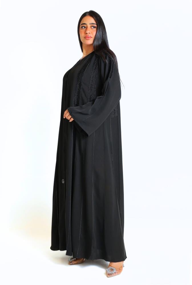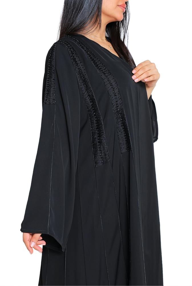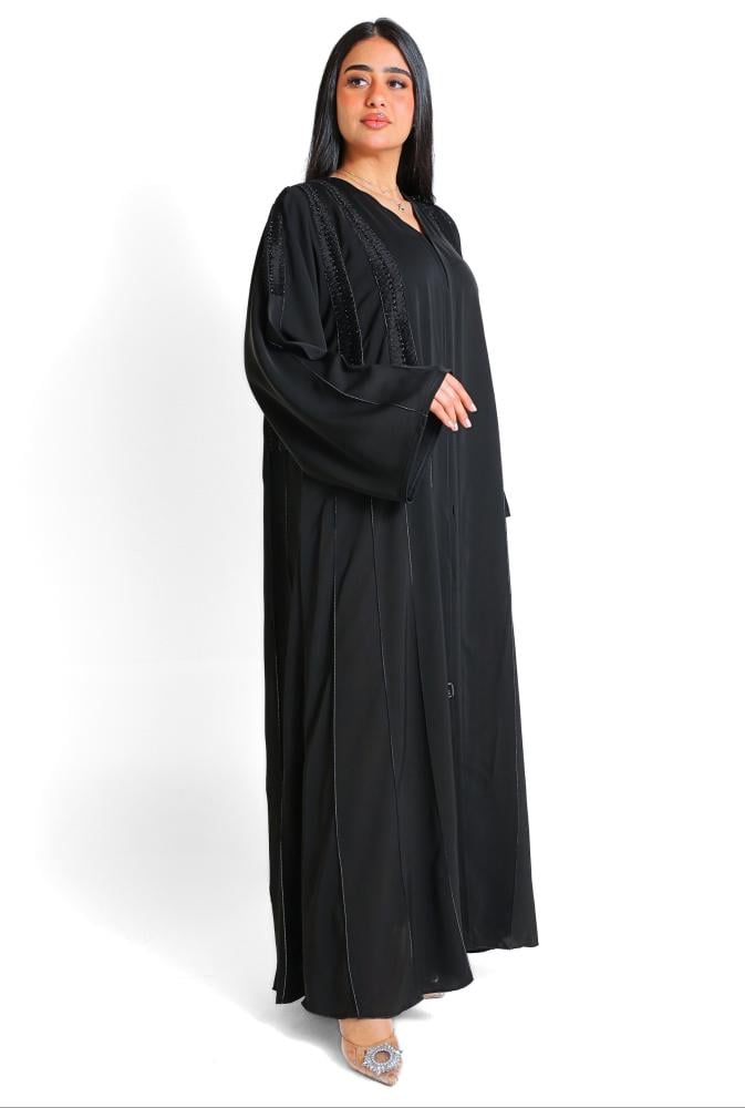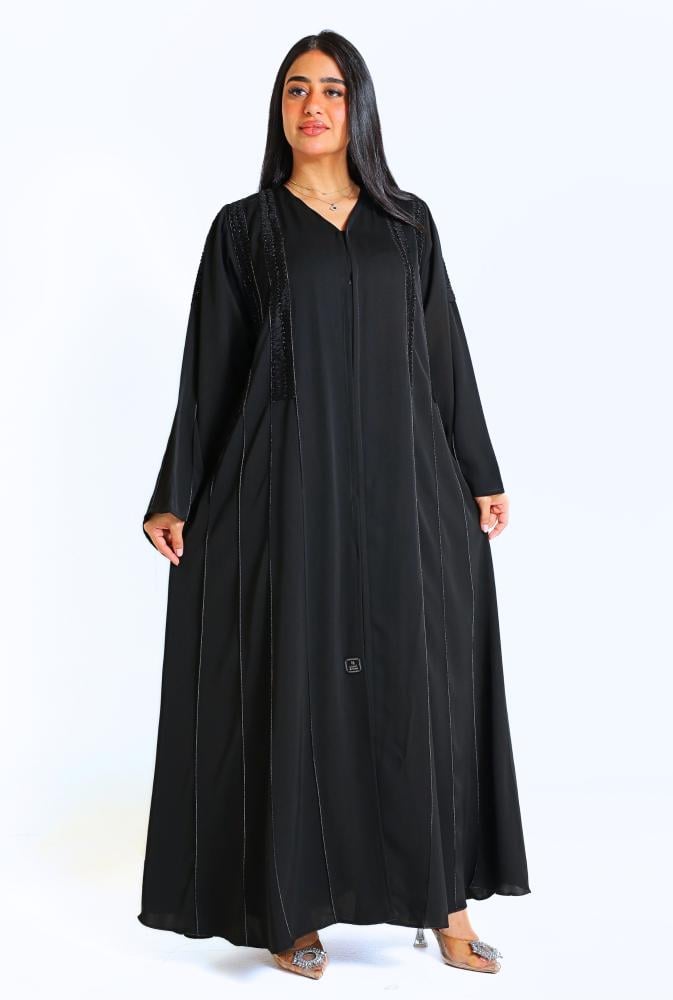 عباية بطرحة تأتي بتطريز خيط و خرز من أمام مزينة بخيط فضي ,لشكل أنثوي و طلة ممزوجة من الأناقة والرقة