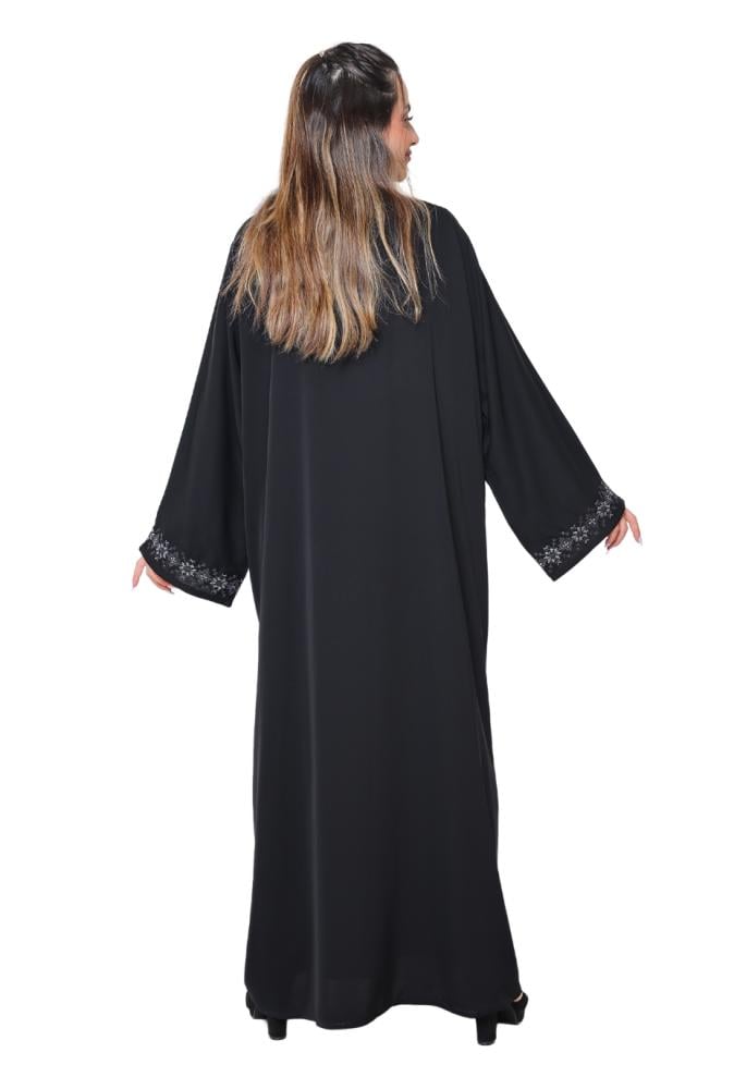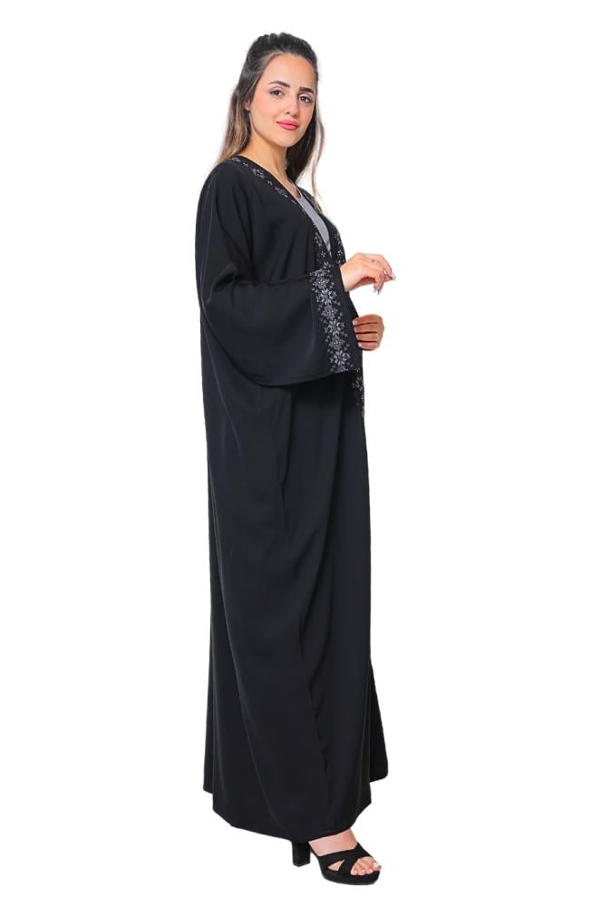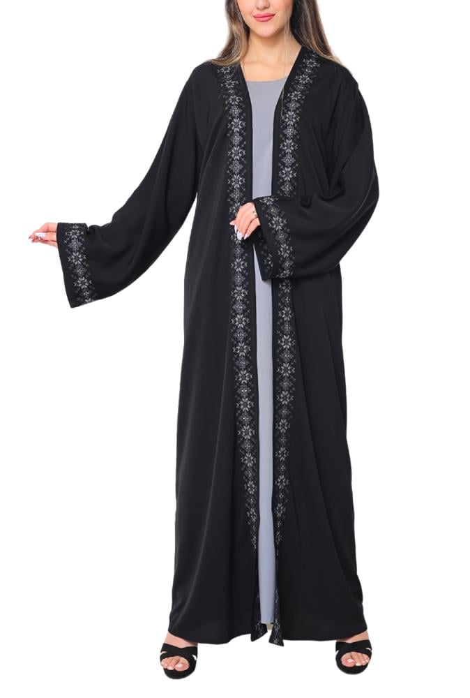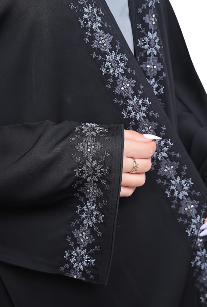 عباية بطرحة لف بتطريز كمبيوتر بلون رمادي وفضي من أمام مزينة بفصوص لمعة
