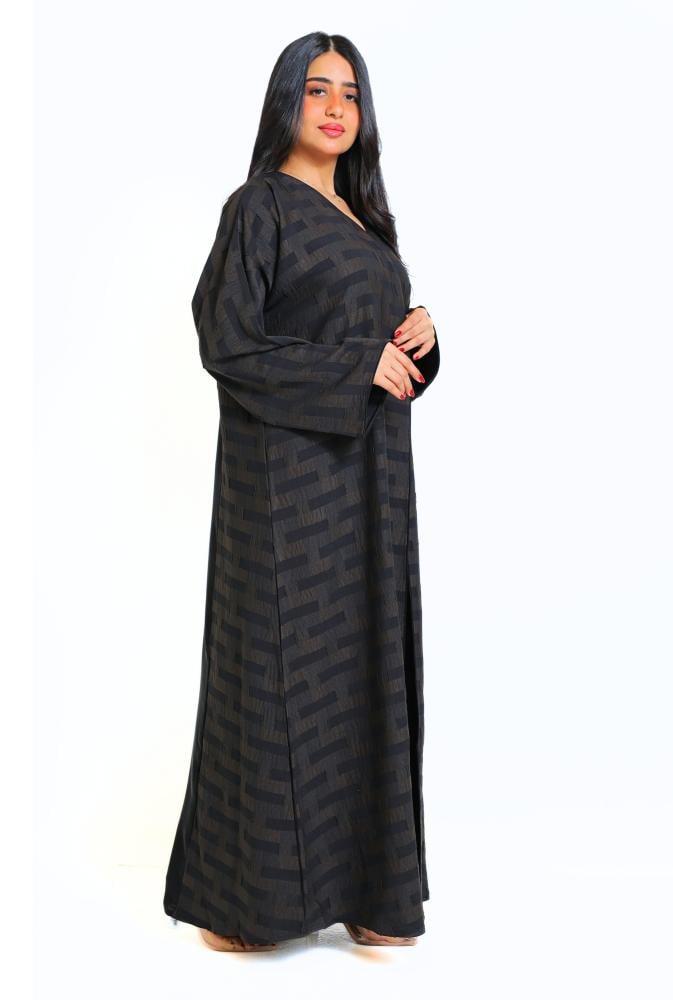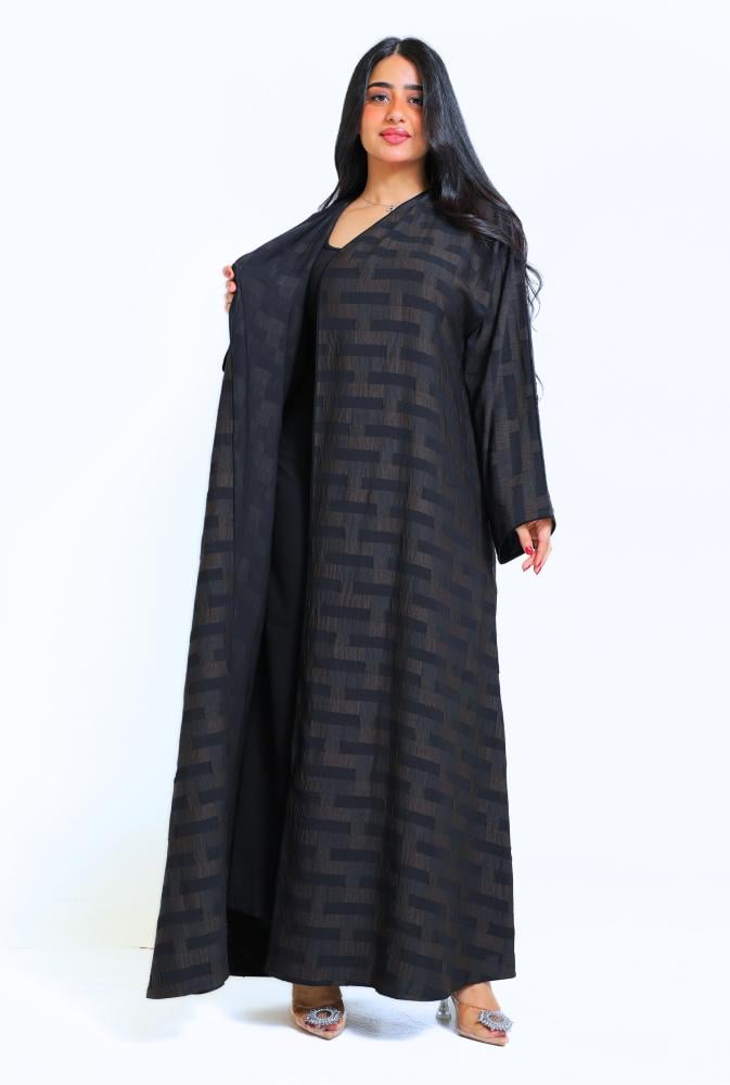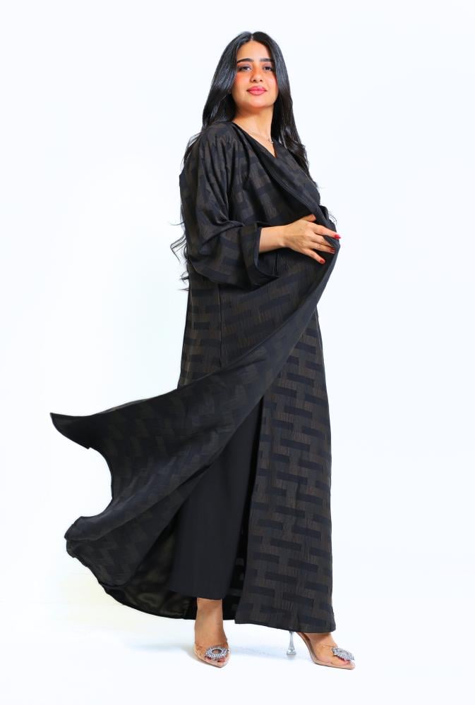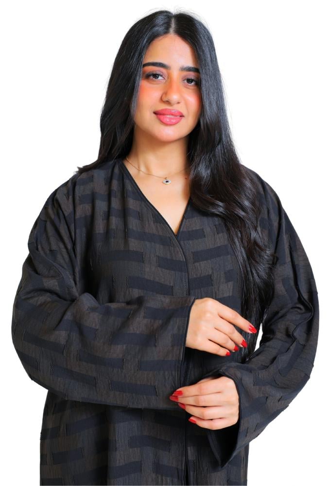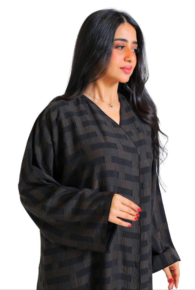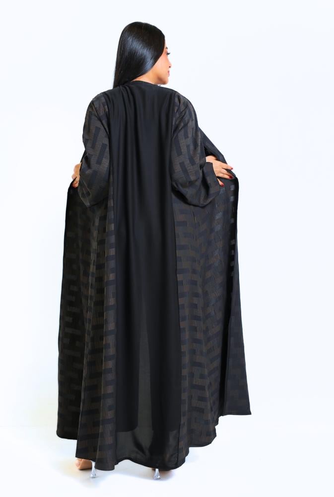عباية لف مقلم محددة بقماش اسود و من الخلف بقماش سادة اسود وسط العباية