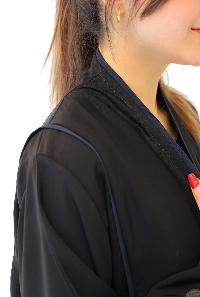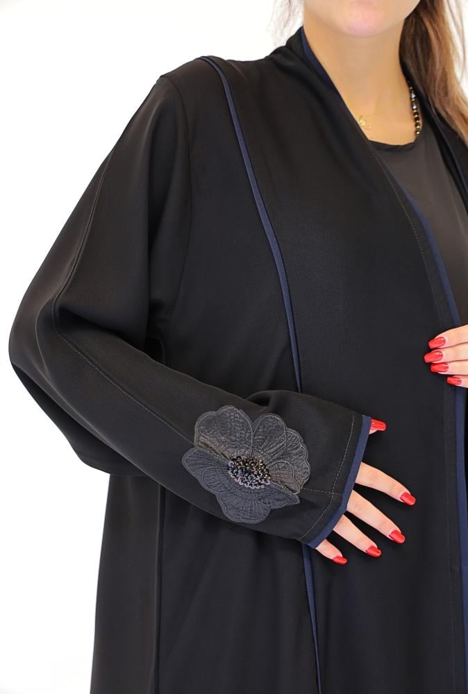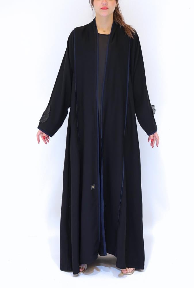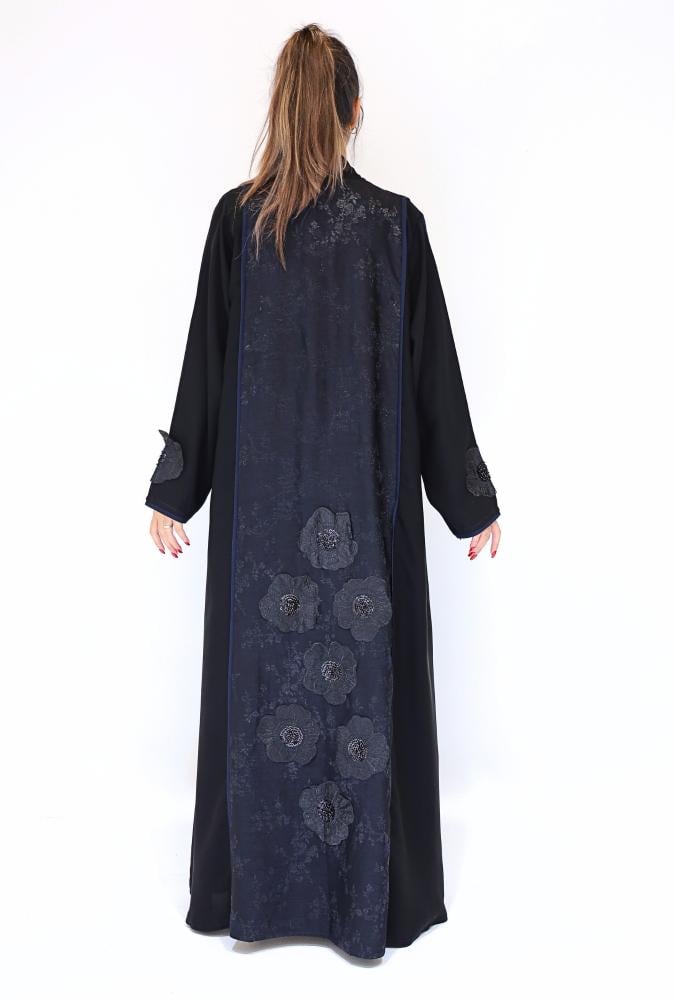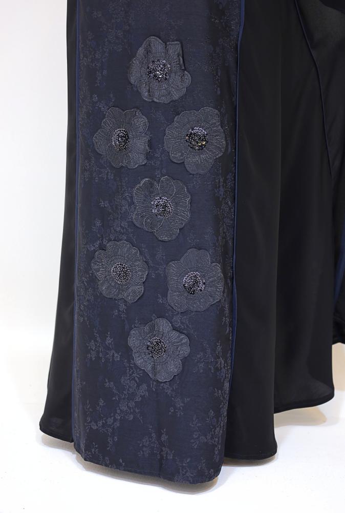 عباية لف محددة بلون كحلي مع قماش جاكر من الخلف بورود اسود
