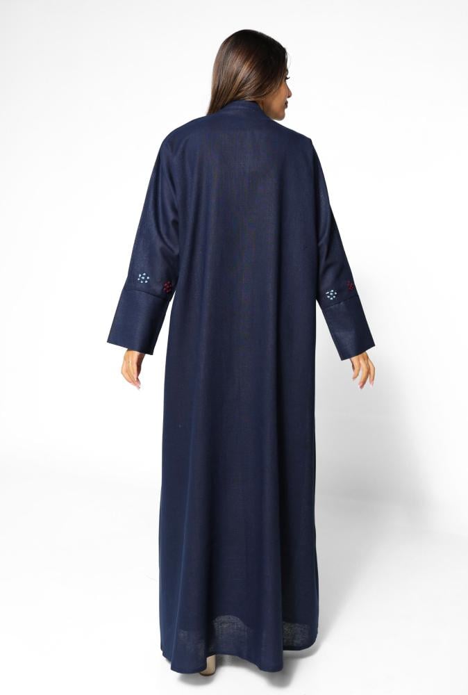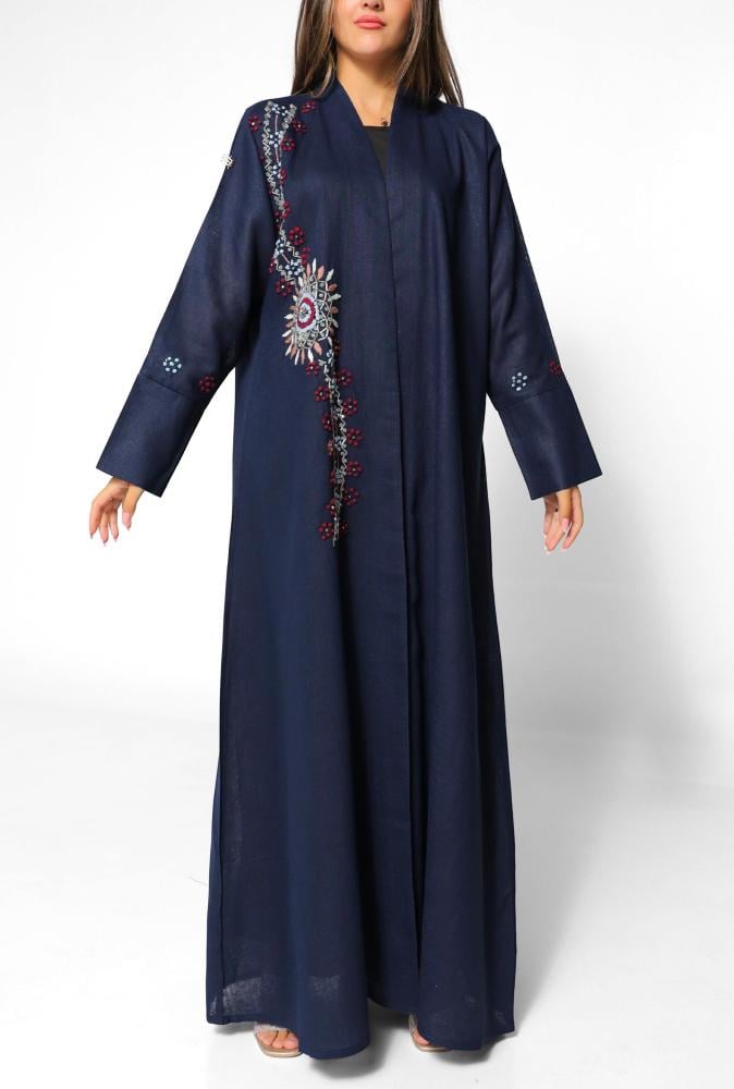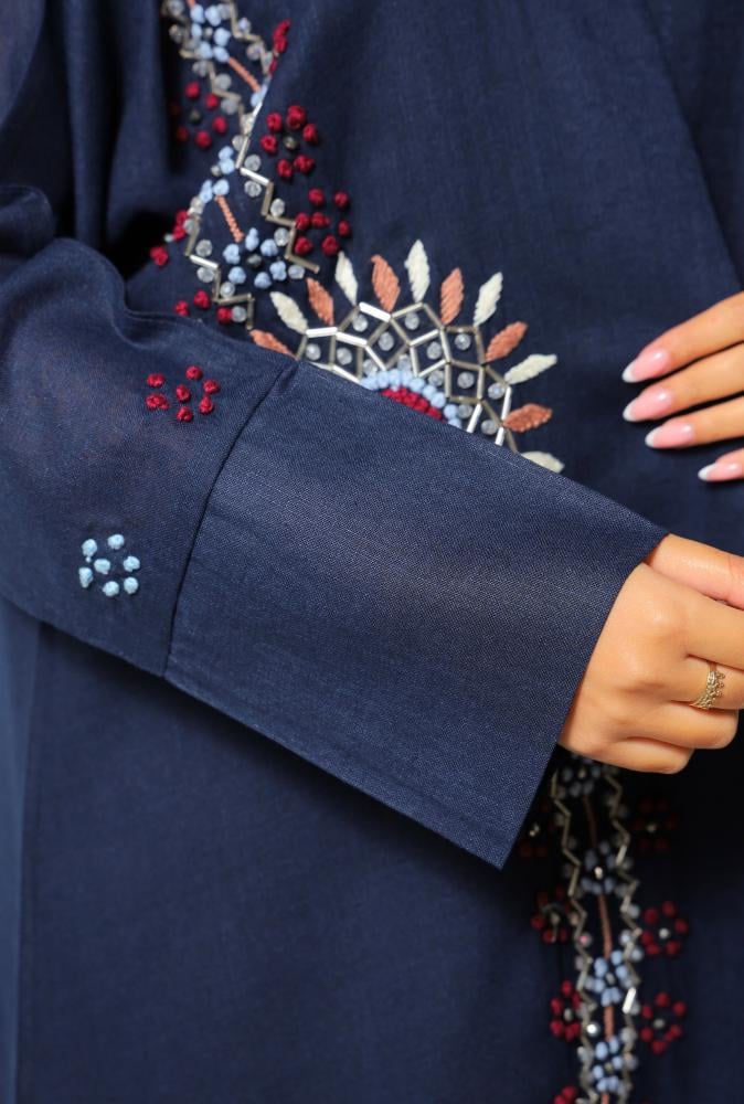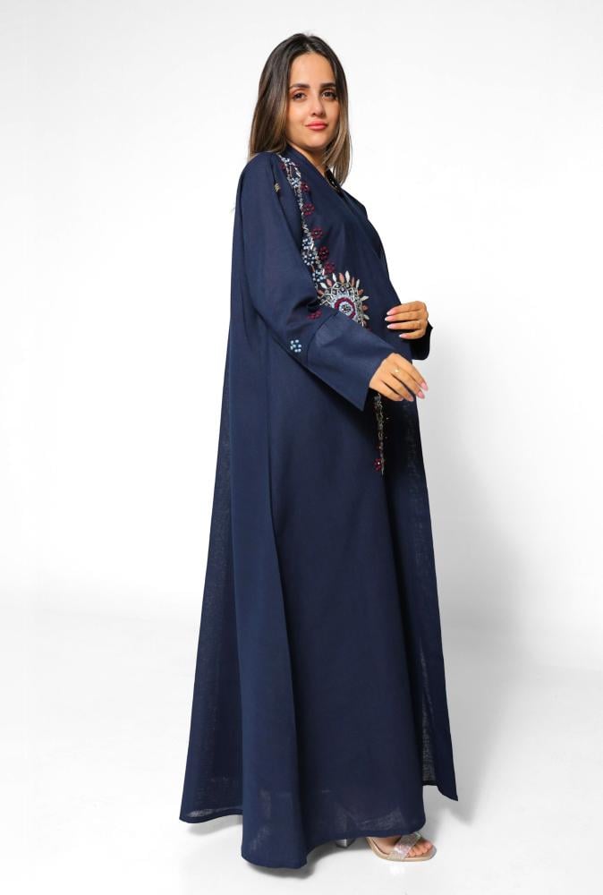 عباية لف كلاسيكية أنيقة مصنوعة من قماش اللينن الفاخر باللون الكحلي الجذاب. تتميز بتطريز يدوي دقيق بلون البيج على الجزء الأمامي بزخارف ورود مميزة تضفي لمسة من الفخامة والرقي. تصميم مفتوح مع أكمام صغيرة يجعلها الخيار الأمثل للمناسبات والزيارات، حيث تجمع بين الراحة والأناقة.