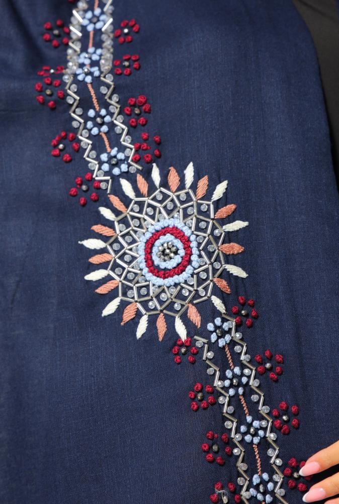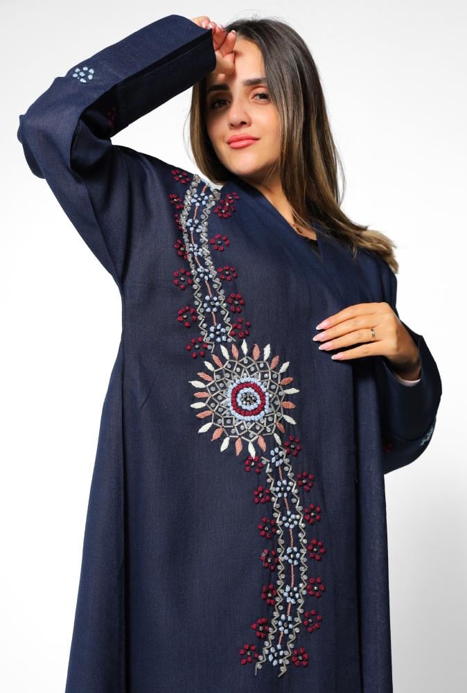 - تناسق الألوان: اللون الكحلي يتناغم بشكل رائع مع التطريز البيج لإبراز جمال التصميم.