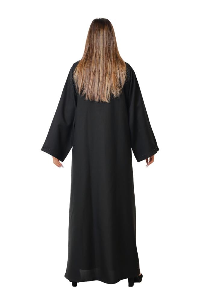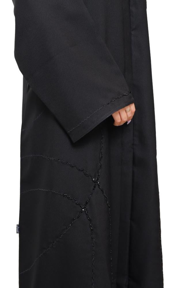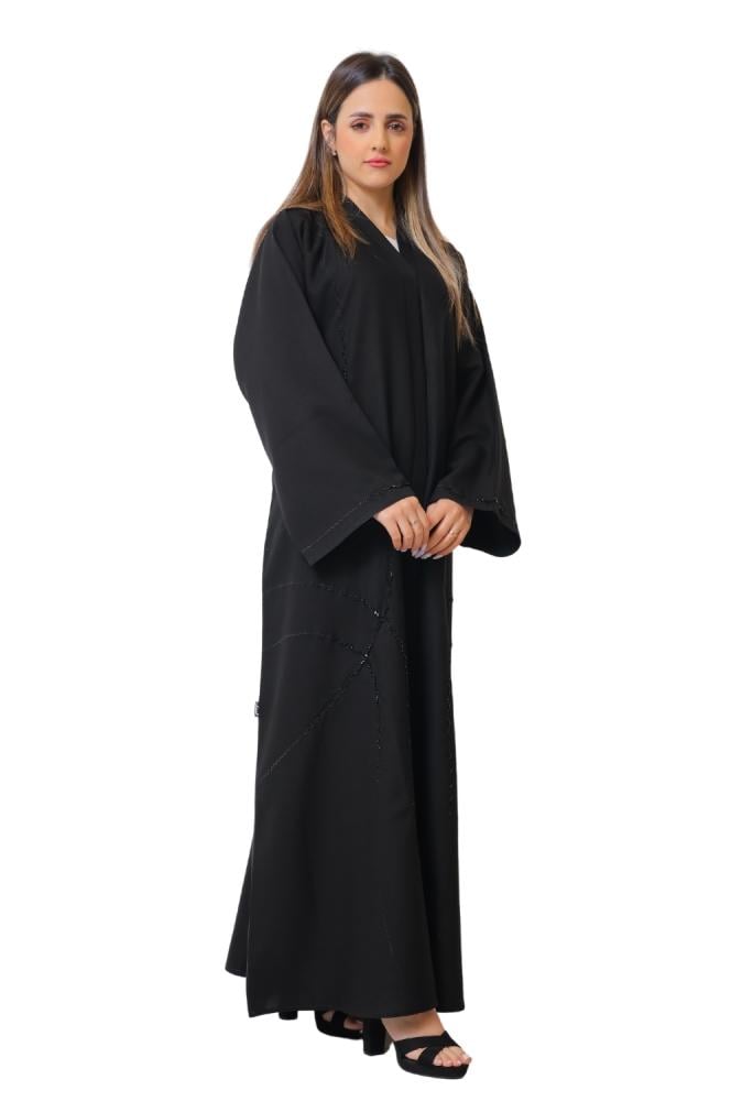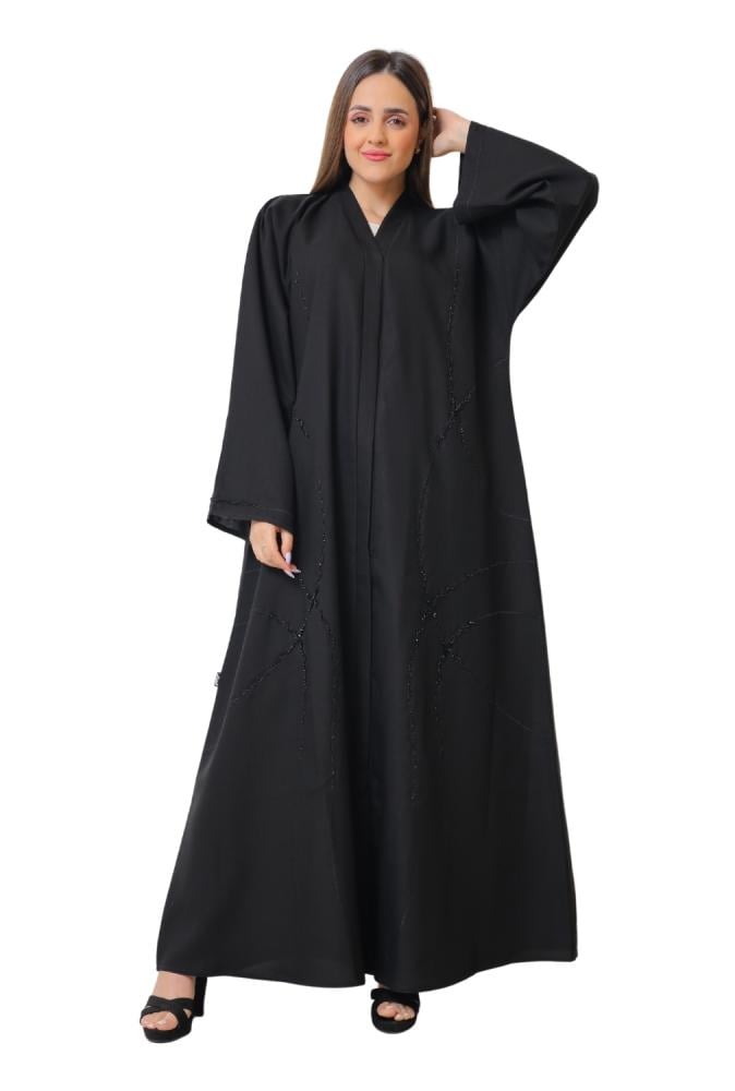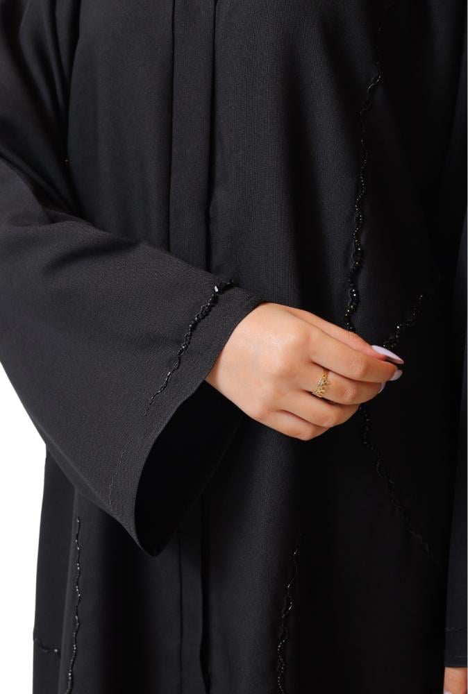 عباية بأزرار من الامام تأتي بشغل يد خرز اسود ناعم من امام واجنب العباية