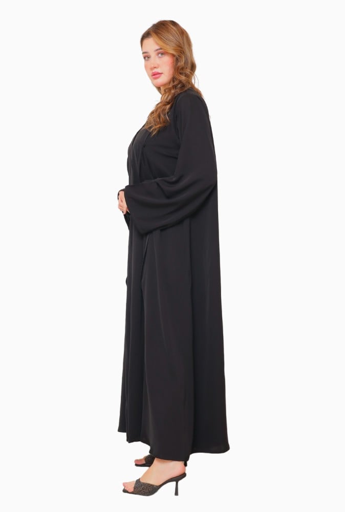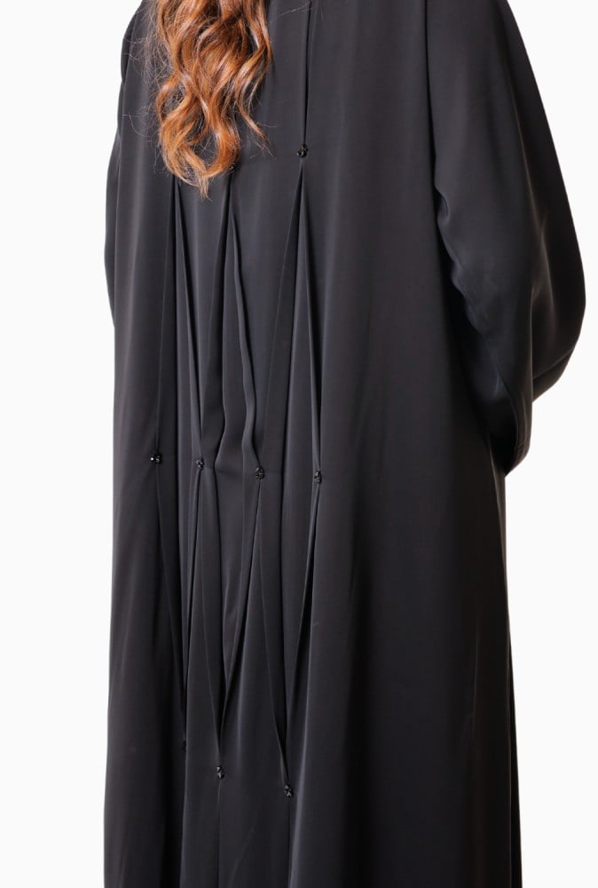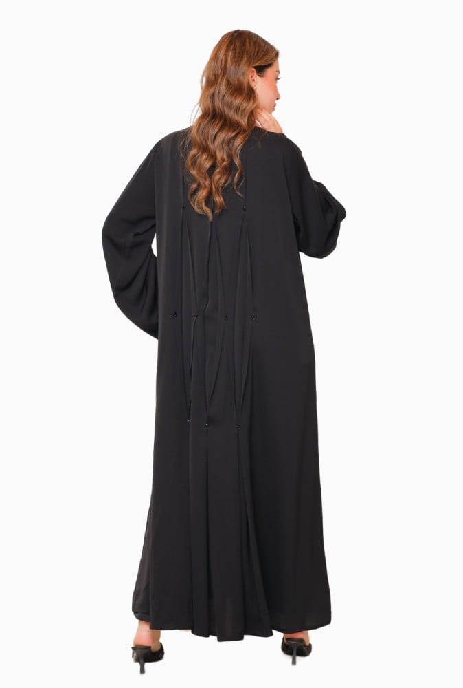 عباية بشغل يد بكسرة متنوعة بشكل ربع كلو ش في القماش مزينة بالخرز الأسود من الخلف والأمام
