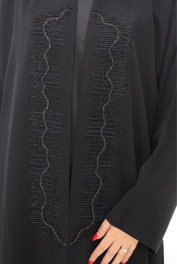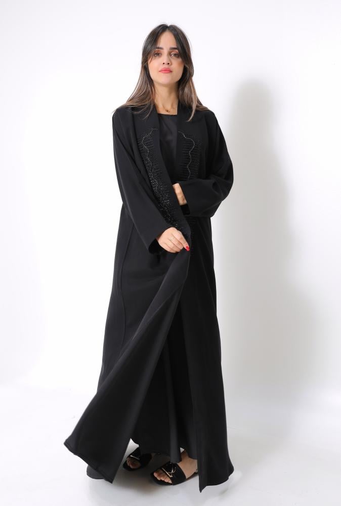 اكتشفي الأناقة الكلاسيكية مع عباية سوداء مصنوعة من الكريب الطايح مزينة بتطريز في الصدر تصميم فريد يمنحك الراحة والفخامة.