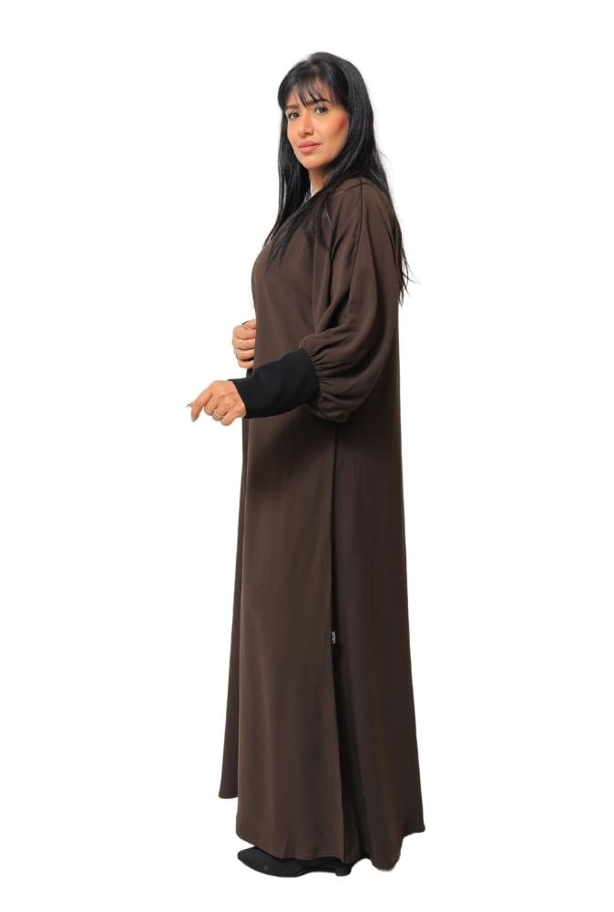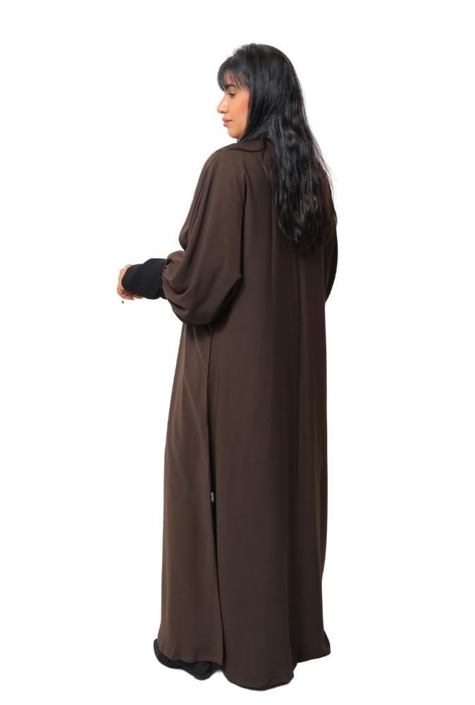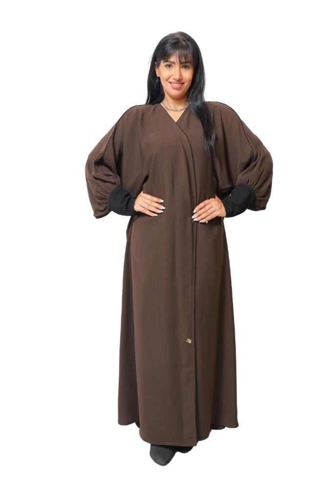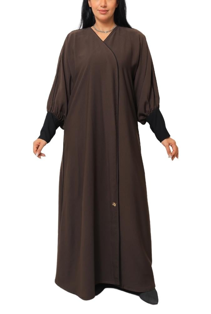 عباية بطرحة لف و بكم كبك كسرات بقماش كتان محدد من أمام بلون اسود انفردي بإطلالة مميزة