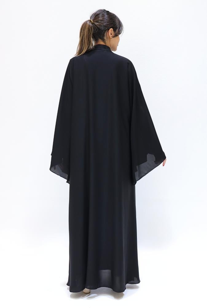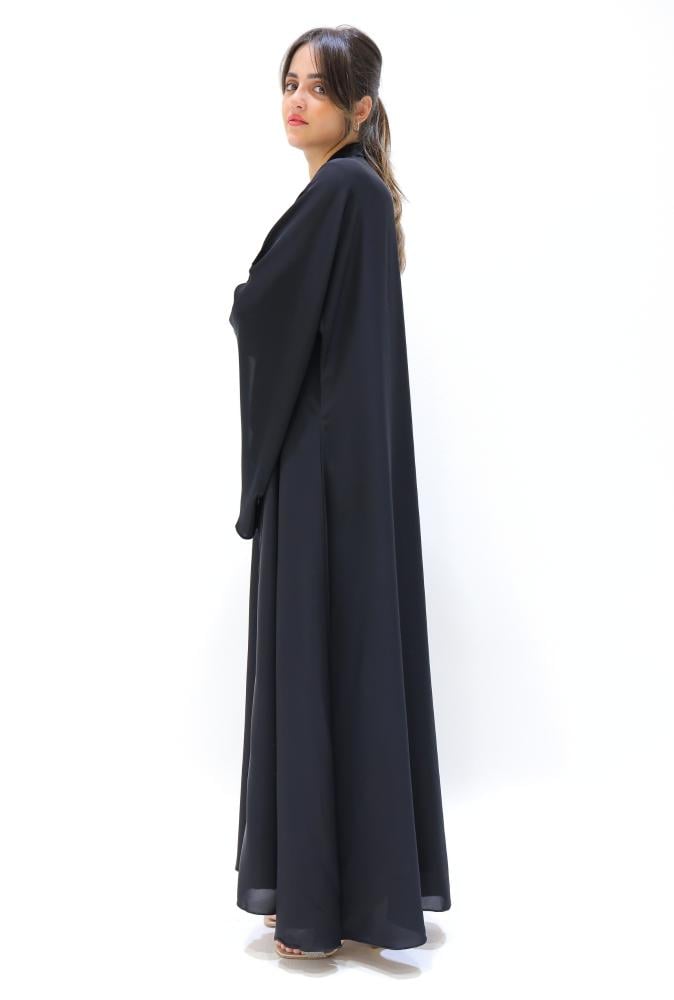 عباية أنيقة بتصميم نص كلوش، مصنوعة من قماش الحرير الفاخر. تتميز بكم مربع واسع وقفلة طقطق، مع لون أسود ناعم يعكس الفخامة. تصميمها المتقن مع الطرحة المثالية يجعلها الخيار الأمثل لإطلالة مميزة وراقية.